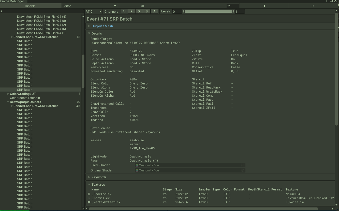 이번에는 특정 커스텀 셰이더(`CustomFX/Ice`)를 사용하는 배치를 Frame Debugger로 분석하는 과정을 살펴보겠습니다.