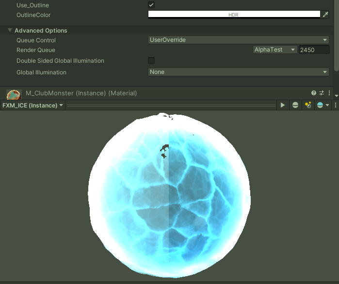 우선 `CustomFX/Ice` 셰이더를 사용하는 여러 오브젝트들이 실제로 `_USE_OUTLINE_ON` 키워드를 다르게 설정하고 있는지 확인합니다.
