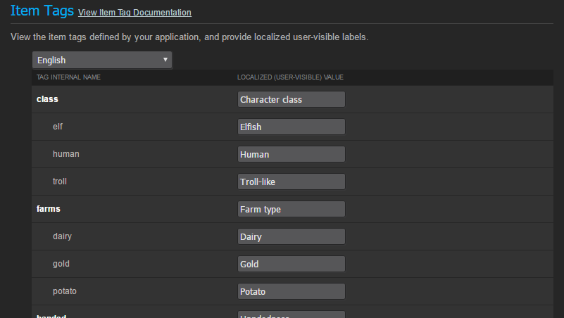 아이템에 대한 태그를 정의한 후 사용자에게 보여주려면 사용자가 볼 수 있는 번역을 제공해야 합니다.